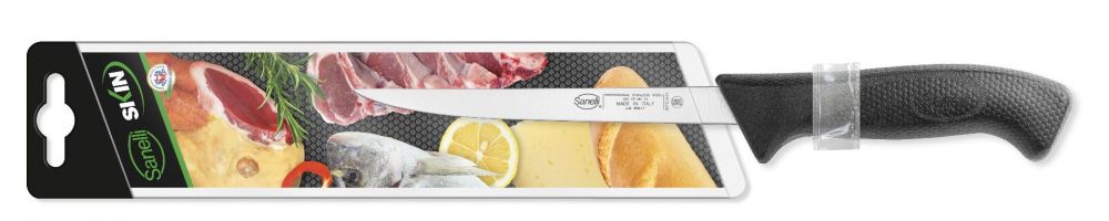 Skin‑kollektionen kombinerar Sanellis högkvalitativa blad med ett enklare handtag än Premana‑serien. Med innovativ textureringsteknik skiljer sig Skin‑handtagets yta från vanliga knivhandtag och erbjuder ett säkert och bekvämt grepp samt smidig användning. Den ergonomiska formen garanterar säkerhet. De använda materialen uppfyller strikta hygien‑ och livsmedelskontaktregler.