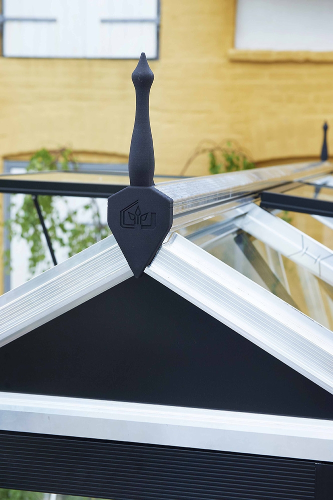 Näyttävä muovinen harjakoriste asennetaan kasvihuoneen harjaprofiiliin. |