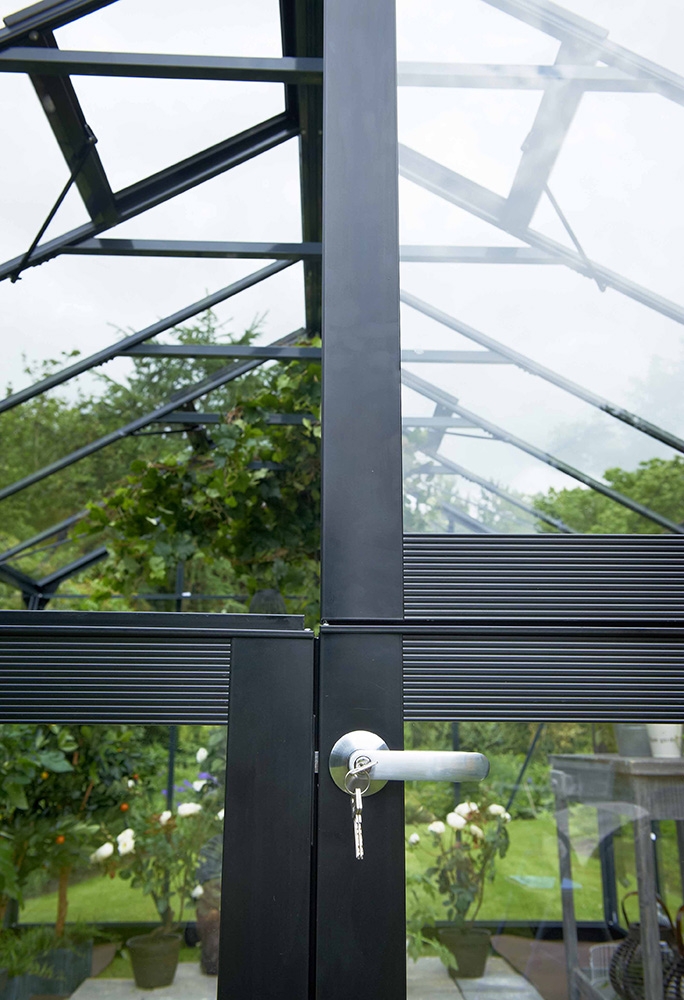 Vankan rungon lisäksi katemateriaalit ovat laadukkaat. Myös yksityiskohdat ovat tärkeitä, sillä niillä on suuri vaikutus toimivuuteen ja käyttäjäystävällisyyteen. Kasvihuoneen kate kiinnitetään listakiinnityksellä, joka viimeistelee huoneen ilmeen. Huoneissa on riittävä määrä tuuletusluukkuja, ja tuuletusta tehostaa myös ovessa oleva, erikseen aukeava tuuletusluukku. Saranaovessa on lukko ja tuulilukitus, eli ovi pysyy auki myös tuulisella säällä. Oviaukossa ei ole kynnystä, joten siitä on helppo kulkea kompastumatta, eikä kottikärryille tarvitse rakentaa ramppia. Räystäskouruissa on puhdistusta varten avattavat suojat sekä syöksytorvet sadeveden talteenottoon. Runko on valmistettu alumiinista, ja kasvihuoneet ovat mallista riippuen saatavana maalamattomana tai antrasiitin harmaana (RAL7016). Ovet, luukut, syöksytorvet, räystäskourun suoja, sokkeli ja peitepalat toimitetaan aina mustana.
