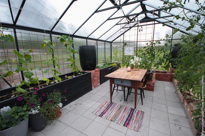 Förutom den robusta stommen är även täckmaterialen av hög kvalitet. Detaljerna är också viktiga, eftersom de har stor inverkan på funktionaliteten och användarvänligheten. Täckmaterialen sätts fast med lister, vilket ger ett slipat utseendet på rummet. Växthusen har ett tillräckligt antal ventilationsluckor, och ventilationen förbättras också genom luckan i dörren, som öppnas separat. Slagdörren är låsbar och har även vindlås, dvs. dörren hålls öppen även i blåsigt väder. Det finns ingen tröskel i dörröppningen, så det är lätt att stiga in och ut utan att snubbla, och det behövs ingen ramp för skottkärra. Hängrännorna har vikbara skyddslister för rengöring och sturör för regnvattenåtervinning. Stommen är tillverkad av aluminium, och beronde på modell fås växthuset med omålad eller antracitgrå (RAL7016) stomme. Dörrar, luckor, stuprör, skyddlisten på hängrännorna, sockeln och täckdelarna levereras alltid i svart.