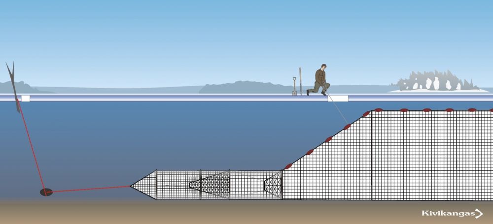 Potkujen päällä on kansi ja alhaalla pohja, joten kalat eivät karkaa, vaikka rysä on kokonaan