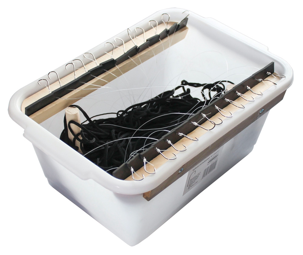 Komplett långrevslåda med 25 krokar (nr 7) för att fiska sik. Färdigt monterad med 3mm:s flätad stamlina ca.50m. Tafsar av monofil (0,22mm). Tafslängd 70cm. 25st krokar med 2m:s mellanrum och markeringsbojar. Praktiskt krokförvaring i gummilister.